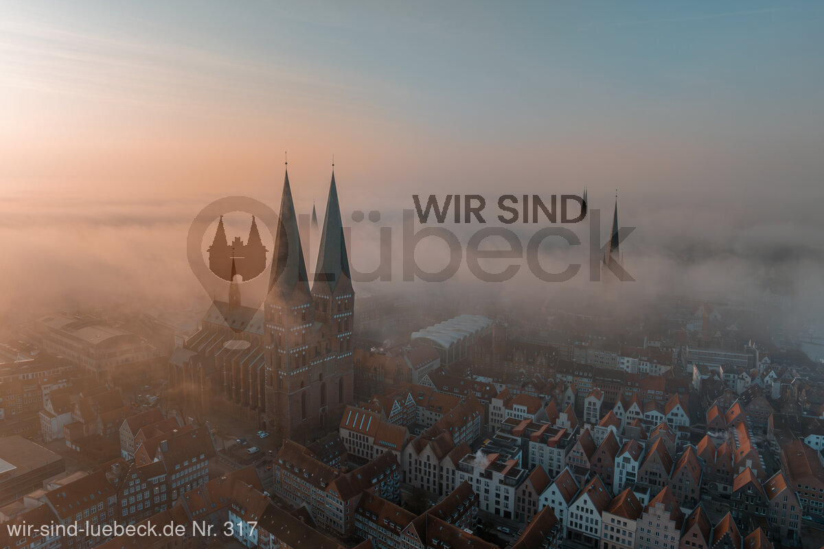 kurz nach Sonnenaufgang, Lübeck in eine Wolkendecke gehüllt, die Marienkirche trotz' den Wolken und wird schon leicht von der Sonnen angestrahlt