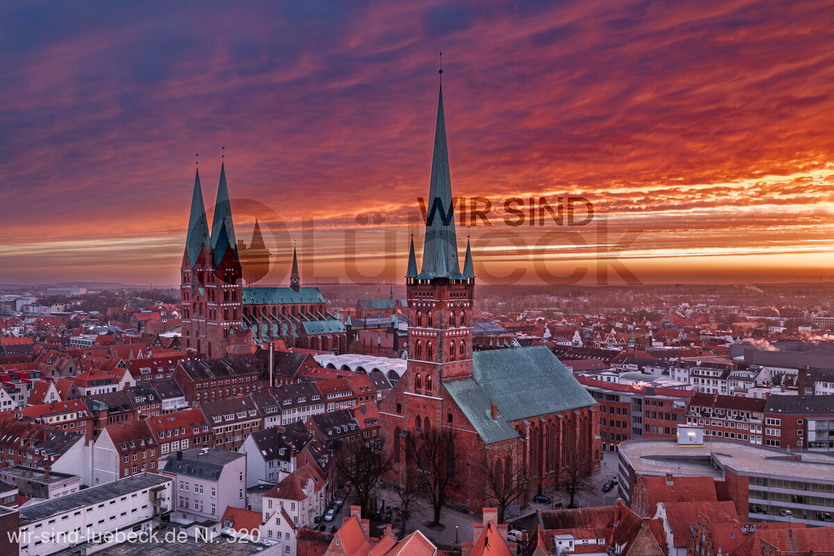 Was ein Himmel über den Dächern Lübecks, die St. Petri-und St. Marien Kirche im Sonnenaufgang in einen farbexplosiven Himmel gehüllt.