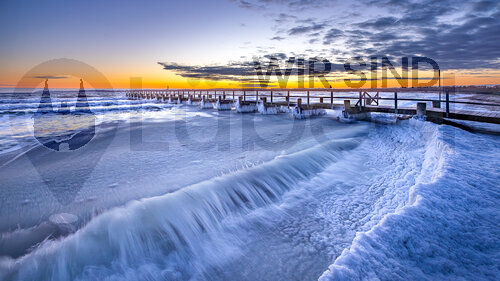 Das Sassnitzer Molenfeuer ist ein berühmtes Naturschauspiel. Im Sommer wie im Winter schlagen die Wellen an die Mauer und übergießen den Turm mit Ostseewasser. Im Winter friert es dann an und gibt wundervolle Strukturen. Im Hintergrund ist die ganze Ostsee eingefroren.