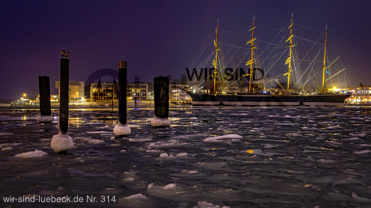 In diesen Tagen wurde die Eisdecke auf der Trave immer dicker und dichter. Abends spiegelten sich dann die Lichter des Passathafens in den Pfützen auf den Schollen. Die Strömung sorgte für ständige Bewegung und zog einige der Schollen die Trave hinauf.